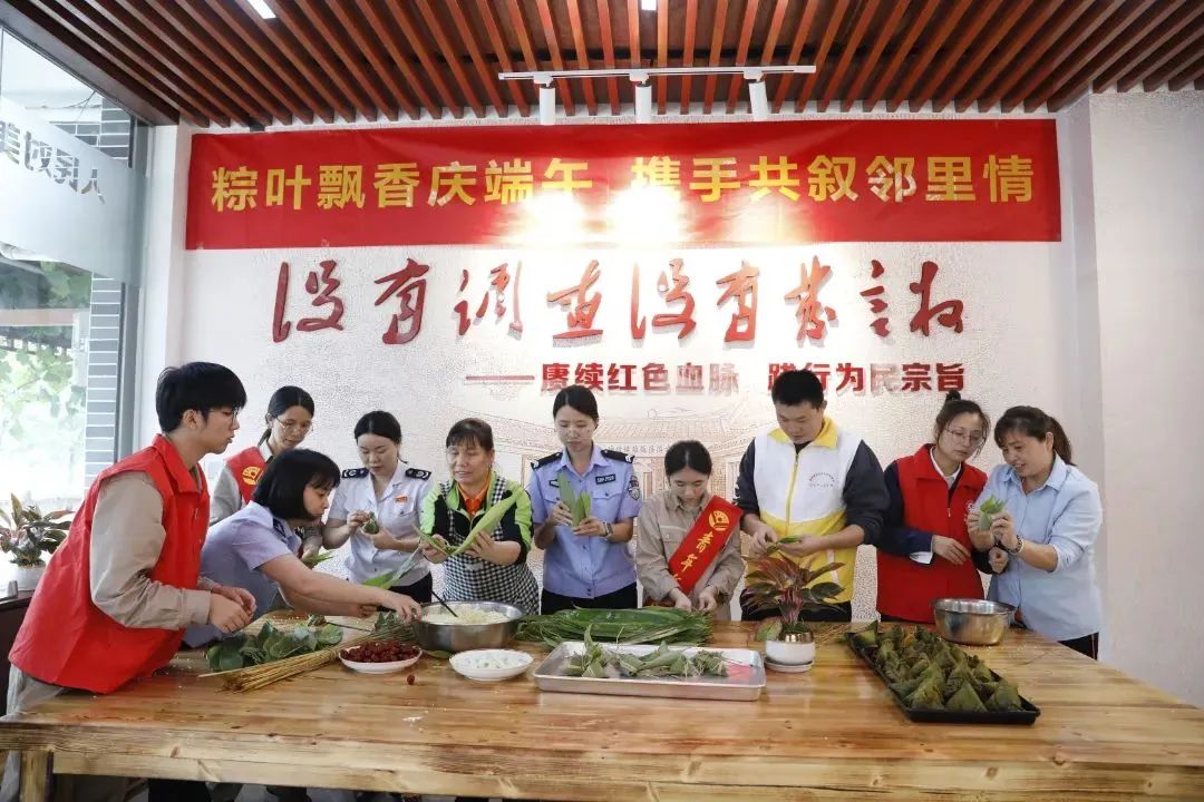 在才溪镇下才村“双满意”为民服务站,国网上杭县供电公司邀请才溪派出所、市场监管所、税务分局、卫生院等近邻党建单位代表及周边居民共同参加包粽子活动。折粽叶、填粽米、裹叶子、绑线……一道道工序有条不紊,浓浓的粽香弥漫着整个活动现场。