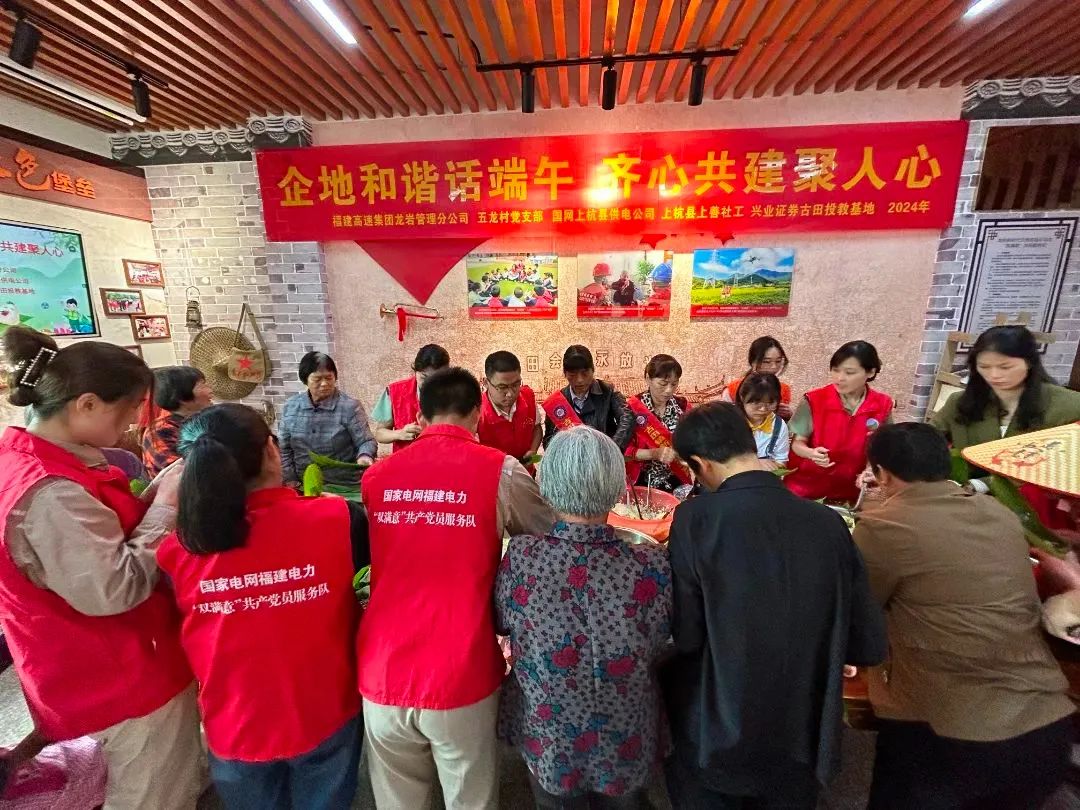 在古田镇五龙村“双满意”为民服务站,国网上杭县供电公司联合福建高速集团龙岩管理分公司、五龙村党支部、上杭县上善社工等党建联盟单位,共同开展“粽叶飘香迎佳节 长者齐聚乐邻里”长者关爱活动。