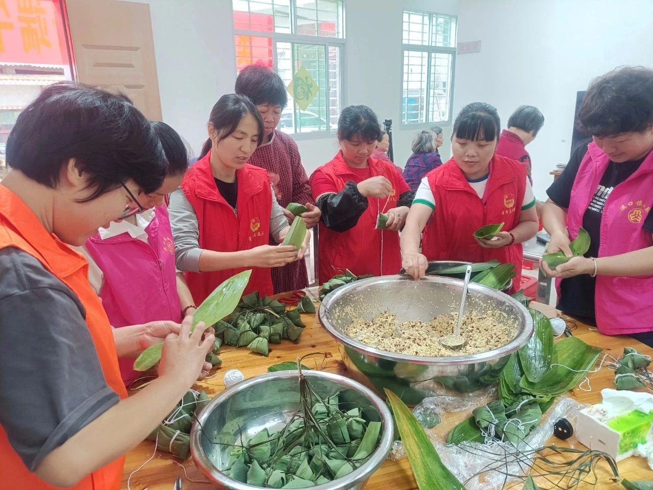 一片绿叶、一缕清香、一根细绳传承着千年的味道,大家分工合作,捋粽叶、填糯米、封口、扎捆,巧手翻飞,一片片粽叶,一粒粒糯米,在大家的手中变成了粽香四溢的美味,转眼变成一个个诱人的粽子。