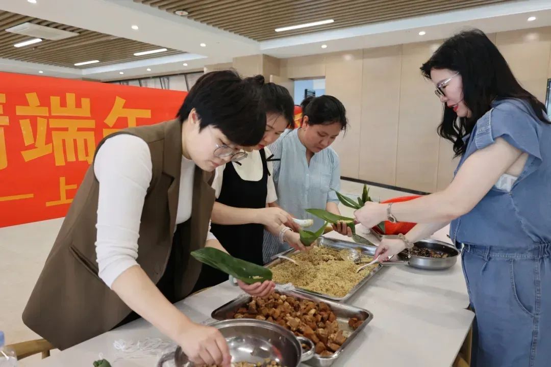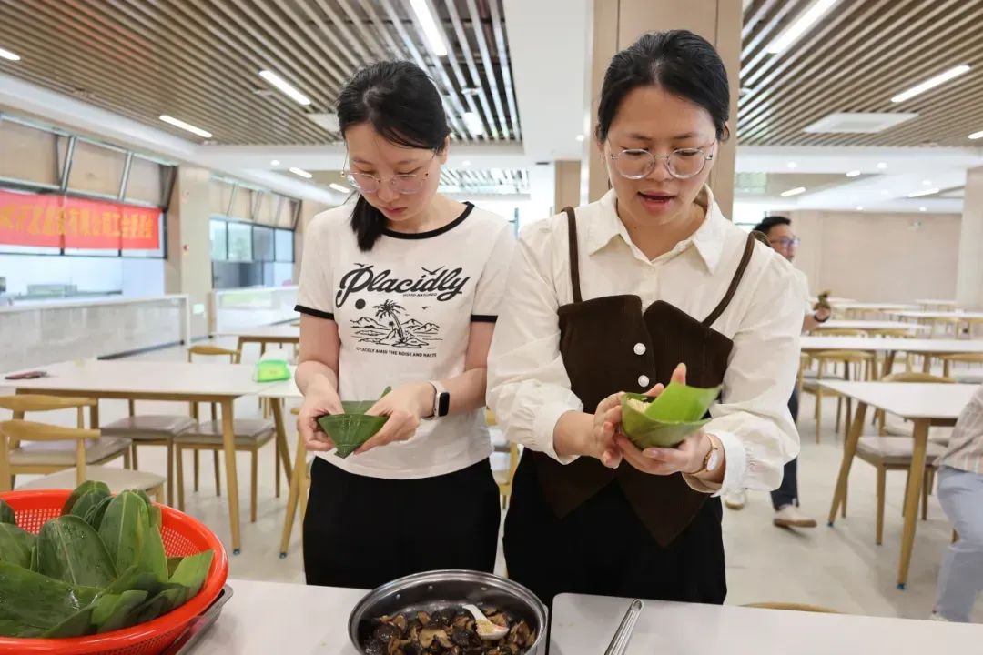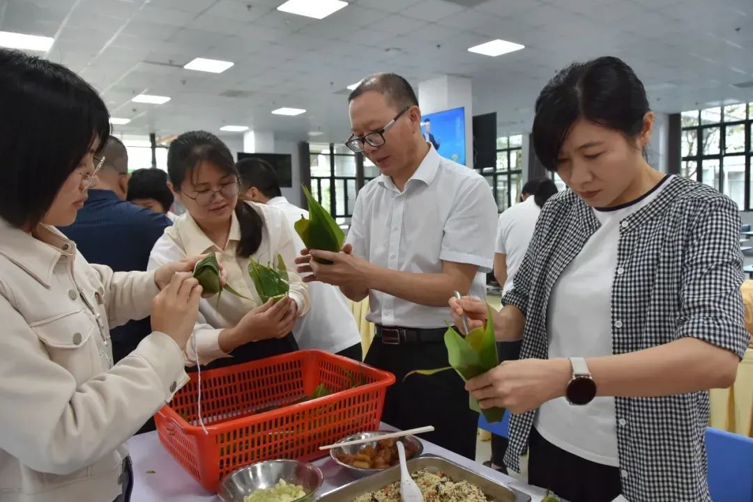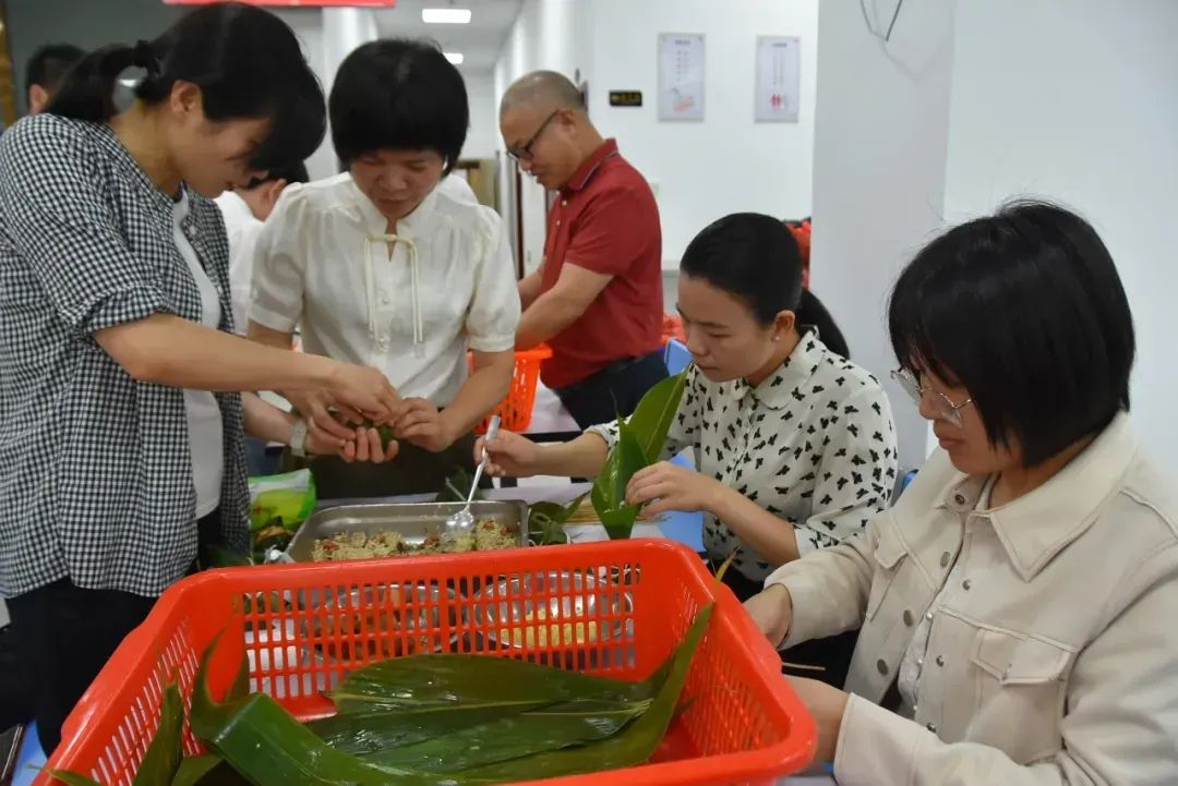 活动现场,粽叶、糯米、鲜肉、红枣等材料整齐摆放在桌子上,干部职工们围在一起纷纷使出看家本领,老手带新手,大家有序取粽叶、添米、压实、封口、捆扎,很快一个个结实而饱满的粽子就在大家的手中诞生。现场其乐融融,洋溢着浓浓的节日气氛。