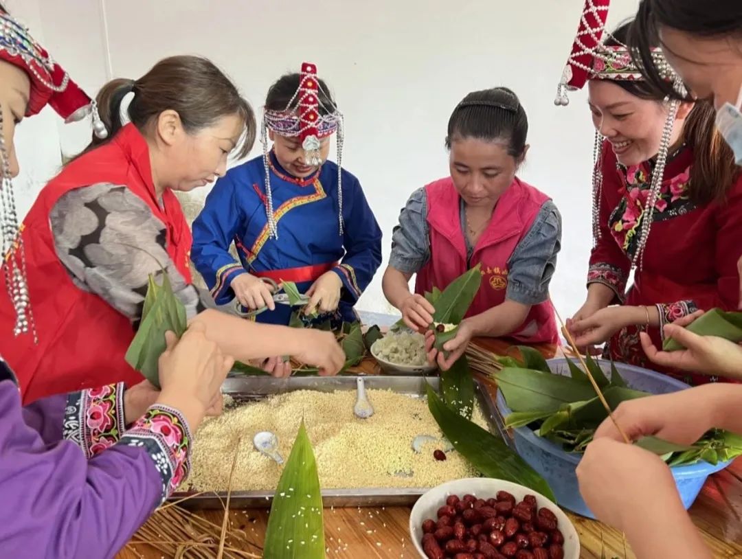活动现场,大家围在一起开心地忙碌着,村民们负责准备馅料、淘米、洗粽叶,挑选好粽叶后,志愿者们跟着村民折叠粽叶、投放糯米、添加馅料、一圈一绕绑着粽子。幸福院里,粽叶翻飞,欢声笑语,其乐融融。一片片粽叶,一缕缕米香,传承着千年的文化,诉说着邻里间真挚的情谊。