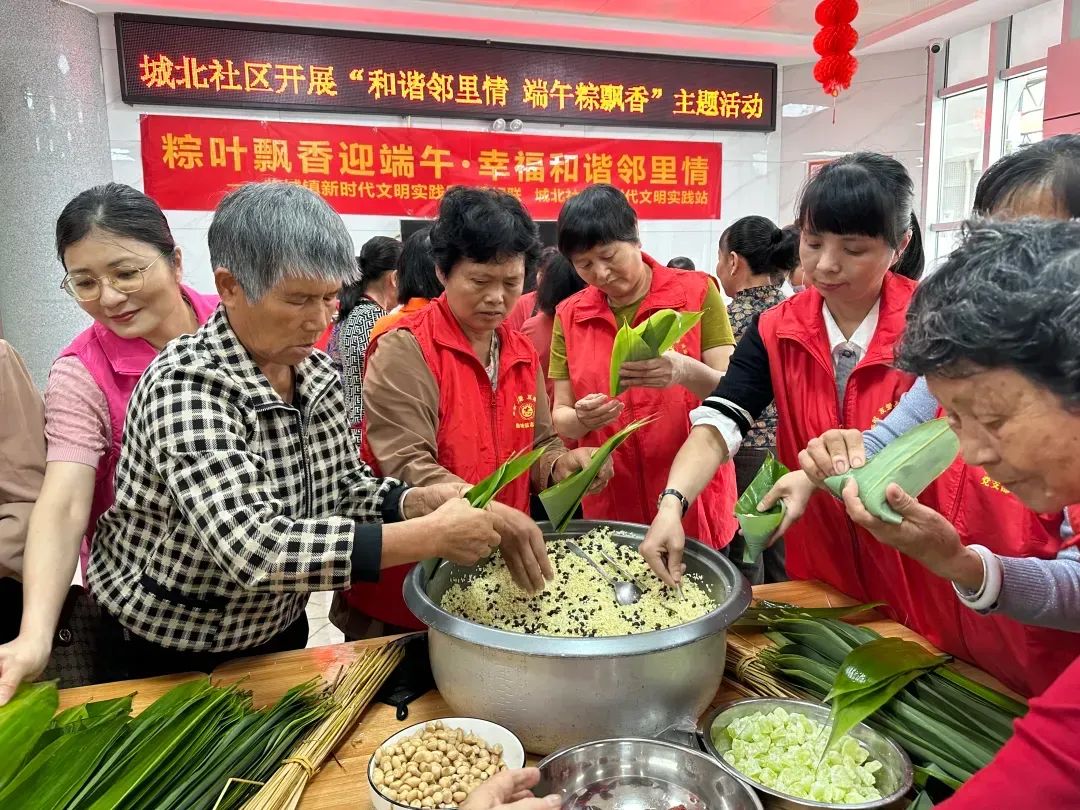 近日,临城镇文明办联合镇妇联、镇社工站在各村(社区)开展 “粽叶飘香迎端午 幸福和谐邻里情”端午节系列主题活动。一双双巧手来回翻转,捋粽叶、填糯米、封口、扎绳,大家交流着包粽子的技巧,互相学习、互相交流,现场欢声笑语,洋溢着端午节的节日氛围。