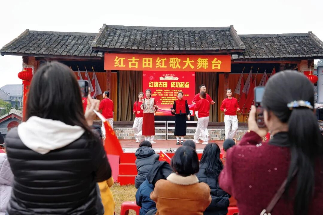 会址旁的红歌大舞台上,一首首振奋人心的经典红歌轮番唱响,不少游客被歌声吸引,情不自禁地挥动手中的国旗,融入这热闹的氛围中。歌声、掌声、欢笑声交织在一起,将新春的祝福洒满这片红色热土。
