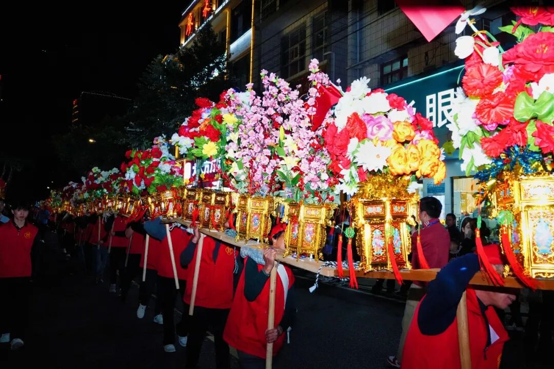 晚上七点半,巡游队伍正式出发。一盏盏匠心独运的花灯次第亮起,光芒流转。队伍中,桶子灯与瓶子灯两种传统造型交相辉映,每块长约1.5米的条凳形木板上各置两盏花灯,花灯内外三层以花篮样式设计,中间饰以精美剪纸,四周的灯纸上用彩笔绘就图案或祝福语。巡游所到之处,光影与人潮交织,锣鼓声与欢笑声相融,整座山城沉浸在欢乐祥和的节日氛围之中。