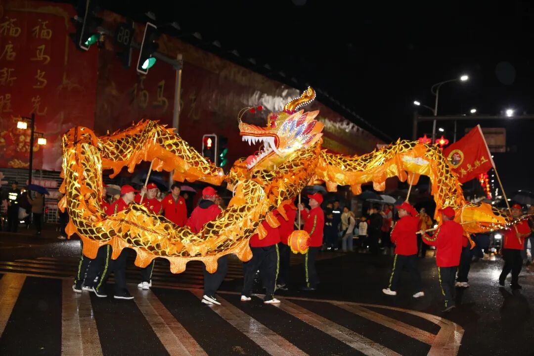 紧随“福马”方阵,气势磅礴的舞龙舞狮队伍震撼登场。金色的长龙在队员们的舞动下上下翻飞、蜿蜒游走,矫健的雄狮腾挪跳跃、栩栩如生。铿锵有力的腰鼓队踏着整齐的节奏,鼓点激昂。色彩艳丽的船灯、形态各异的走马灯等方阵依次行进,表演者身着传统服饰,载歌载舞。巡游队伍宛如一条流动的璀璨灯河,所到之处,欢声雷动,围观人群摩肩接踵,纷纷举起手机记录这热闹的场景。