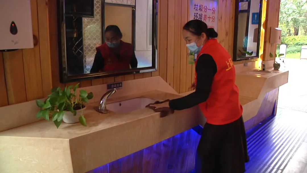 【公厕保洁员 郭晓英:就像自己的家一样,一上班就看有没有垃圾、蜘蛛网,就开始擦拭各台面,把洗手盆擦干净,然后打扫蜘蛛网,拖地板。】