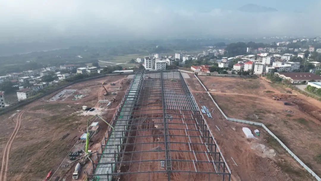 近日,在龙净量道年产6GWh锂电池储能系统项目一期现场,5#综合车间钢结构主体结构吊装已完成,工人们正紧锣密鼓地加快屋面板和墙面板安装等作业。