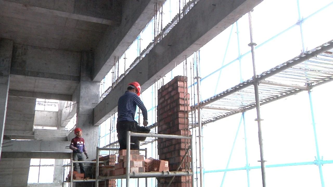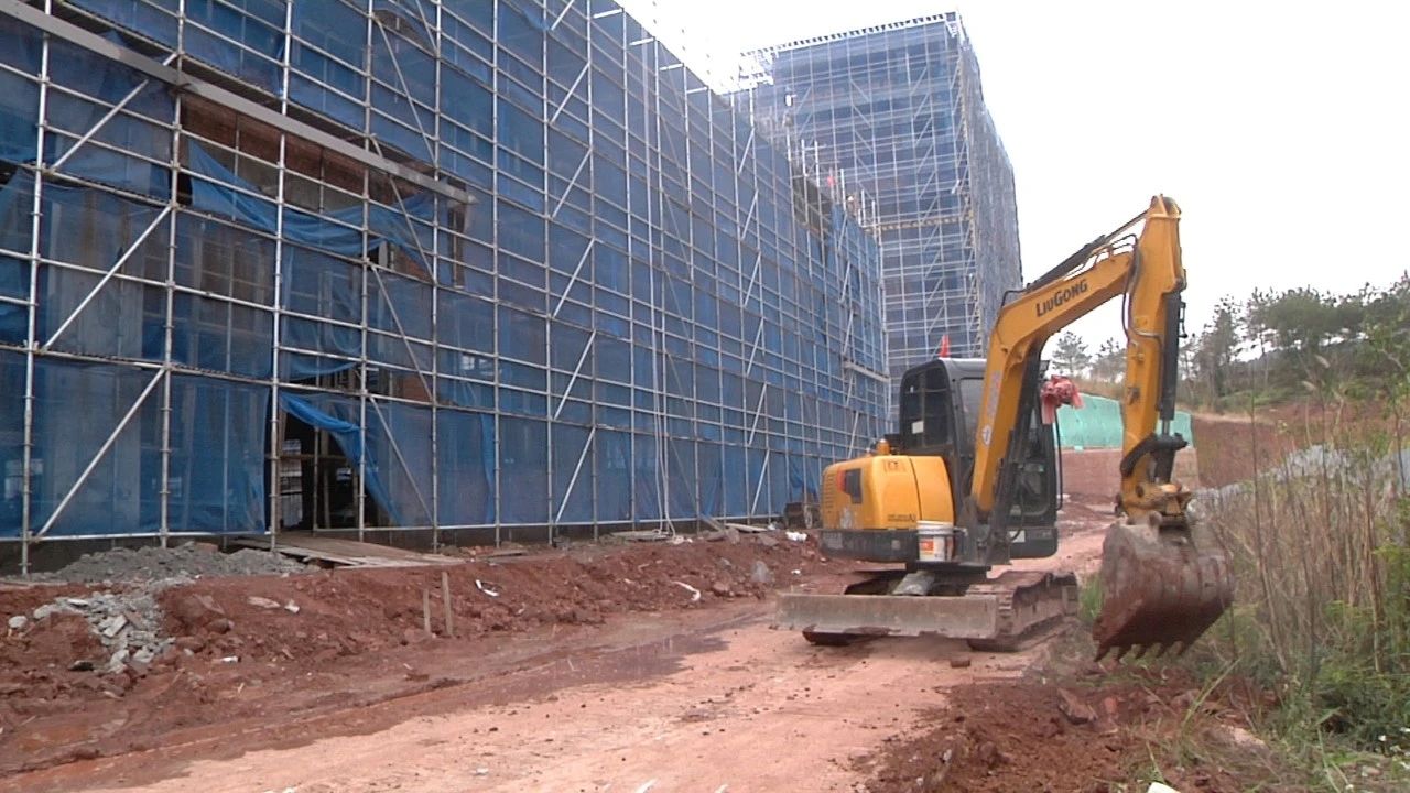 【上杭国港汇数字智慧化供应链建设项目经理 张贵春:现阶段我们管理服务中心室内装修基本完成,仓储中心砖墙砌筑已经完成,现正在内外墙装饰工程施工,供应链云服务中心主体框架已经建设完成,砖墙砌筑至五层,大门值班室和围墙基础也在同步施工。】