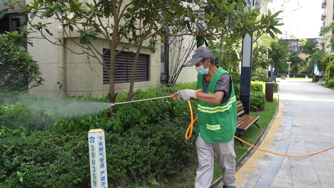 近日,在西门宏盛园小区内,物业人员正背着喷雾器对绿化带、楼道角落及排水沟等易滋生蚊虫的区域进行细致消杀。