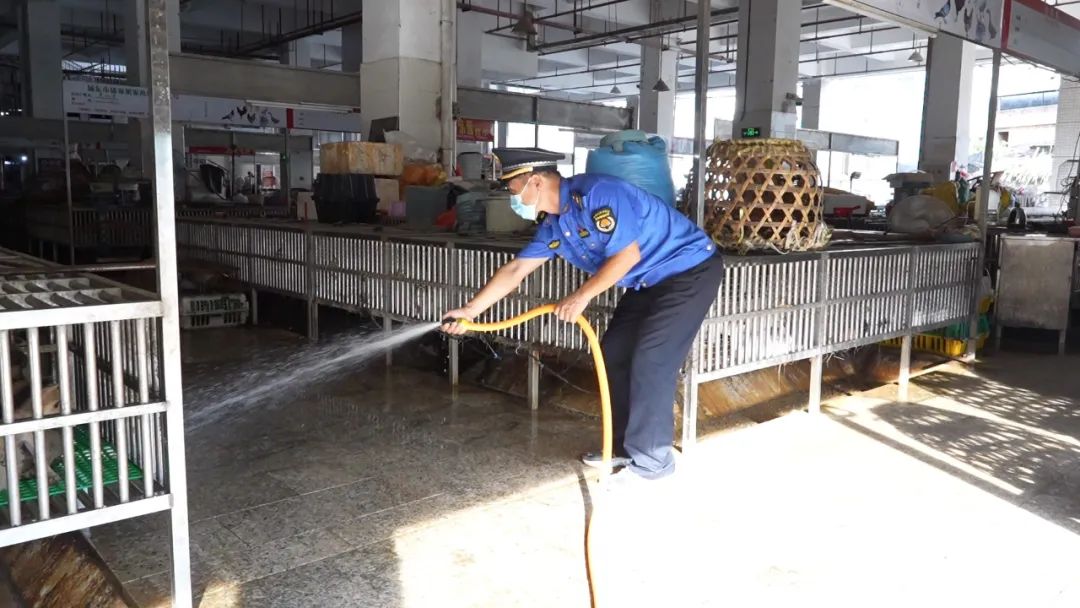 与此同时,农贸市场人员密集、环境复杂,卫生管理尤为重要。在城东农贸市场,县市政设施中心市场管理所组织人员,针对生鲜售卖区、活禽宰杀点、排水沟渠、摊位底部等卫生重点和蚊虫易聚集区域,进行精准、彻底的药物喷洒和环境清理。