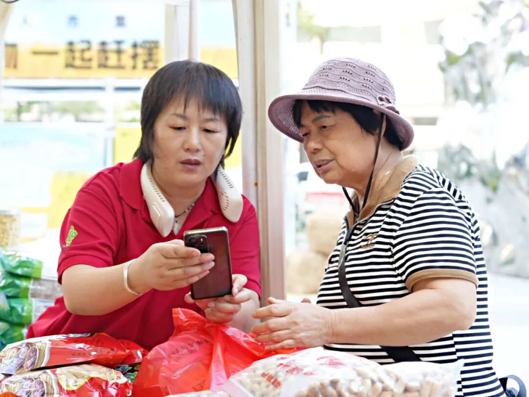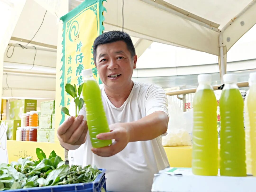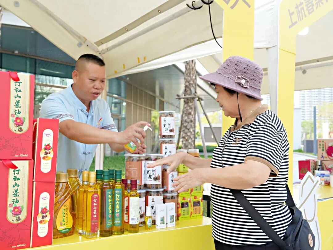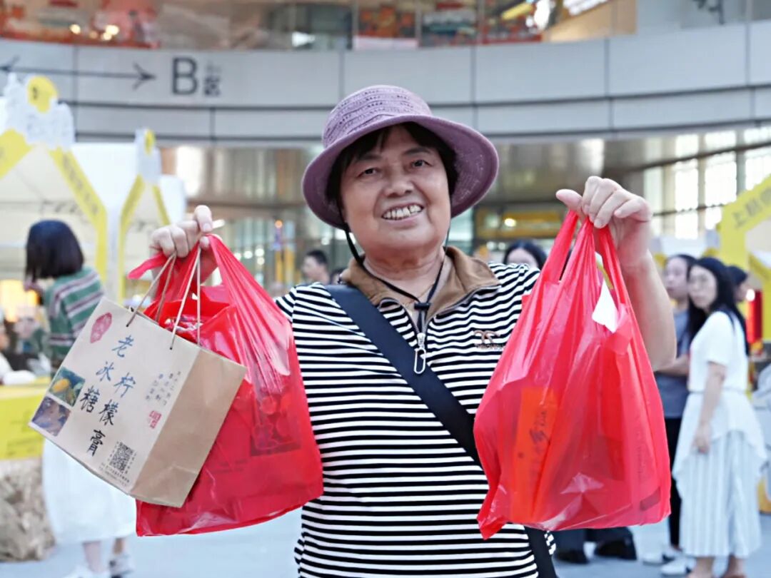 除了美食体验,市集还设置了农产品展销区。上杭萝卜干、红米黑米、杭梅系列产品等地道农产品吸引众多市民驻足选购。在厦门生活近二十年的上杭籍市民李金玉得知市集消息后,特意提早前来,采购了不少家乡味,并开心地向记者展示。