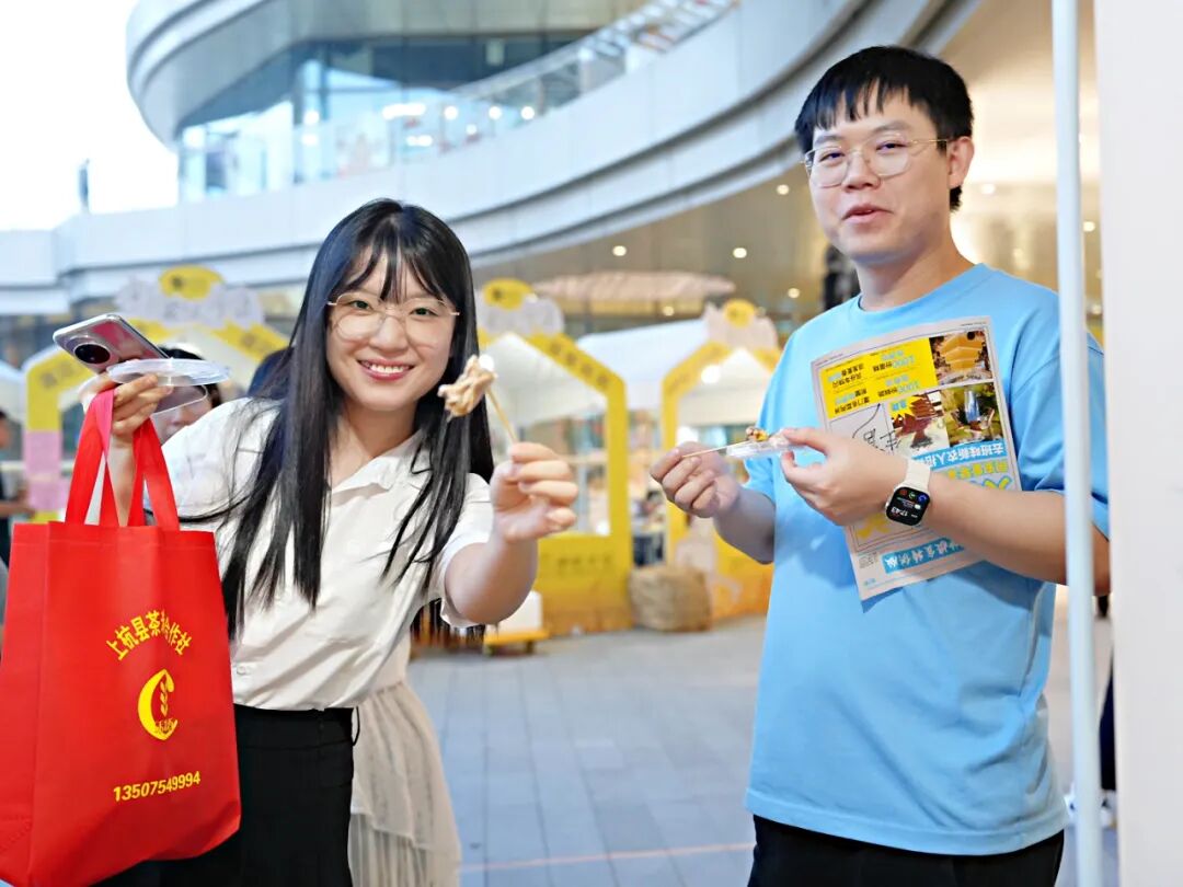 傍晚时分,爱琴海商场入口处的“新农人市集”逐渐热闹起来,上杭县精心布置的十个展位前人头攒动,现场弥漫着牛肉丸、蒸鸡等客家特色美食的浓郁香气,不少市民闻香而来,争相品尝。