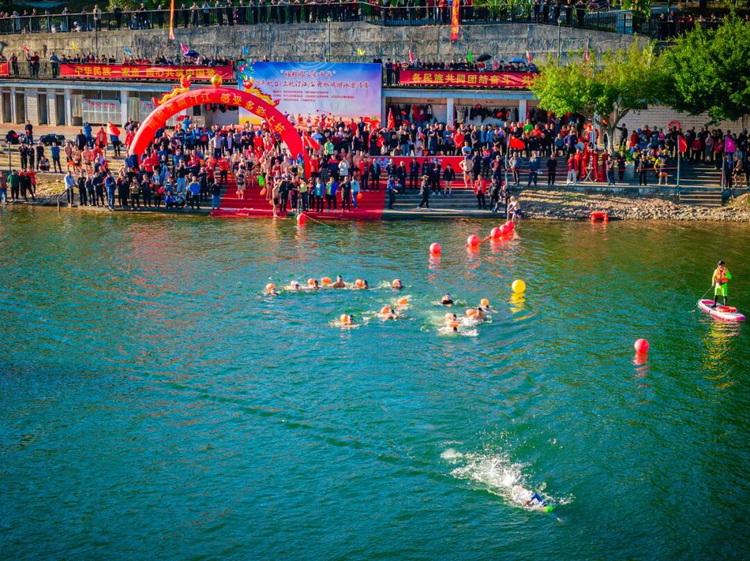 随着裁判员的一声令下,参赛选手们分批入水,一片碧波间翻腾起阵阵白色的浪花。在清澈宽阔的江面上,选手们精神饱满、奋力向前,开展速度与耐力的较量。
