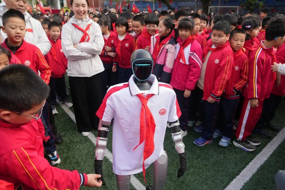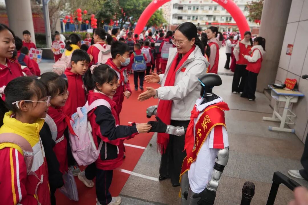 清晨7时30分,身穿校服的人形机器人、活蹦乱跳的机器狗与校领导、大队干部一起站在校门口,列队欢迎返校学子。孩子们背着书包走进校门,惊喜地打量着这些会挥手的“新朋友”。校领导们分列两侧,为每位学生递上装有祝福的新年礼包,祝愿他们新学期“码”力全开,逐梦前行。