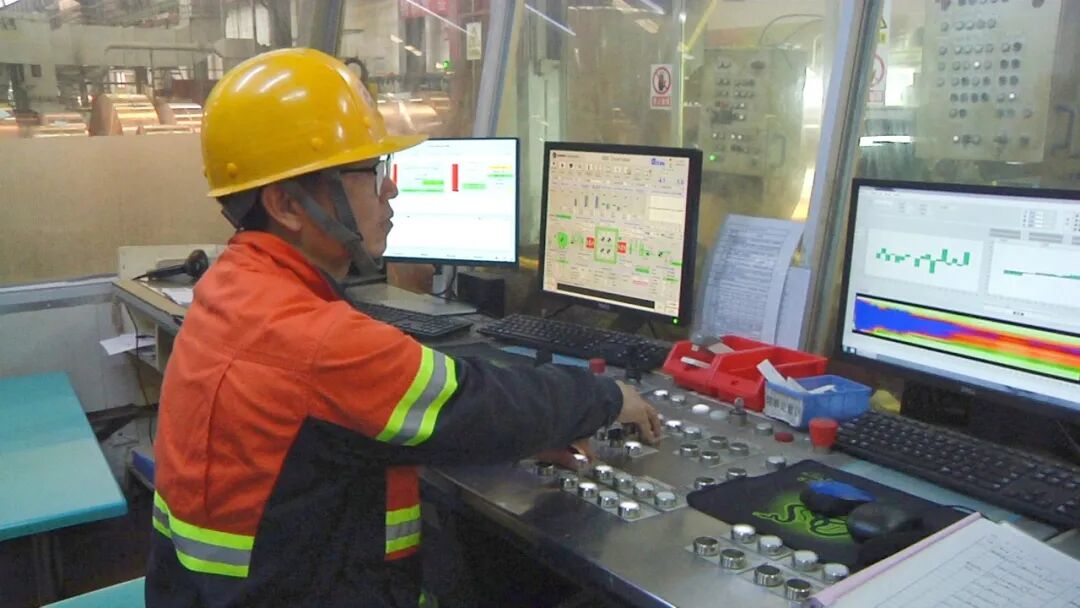 在福建紫金铜业有限公司冷轧三车间,车间内生产线高速运转,铜板带在自动化设备中有序卷取成型;操作台前,技术人员专注监控着显示屏上的各项参数,并实时调整,确保生产流程的精准与高效。