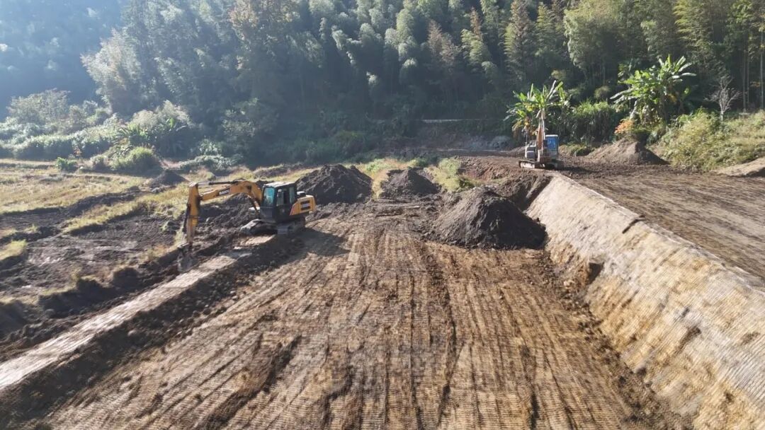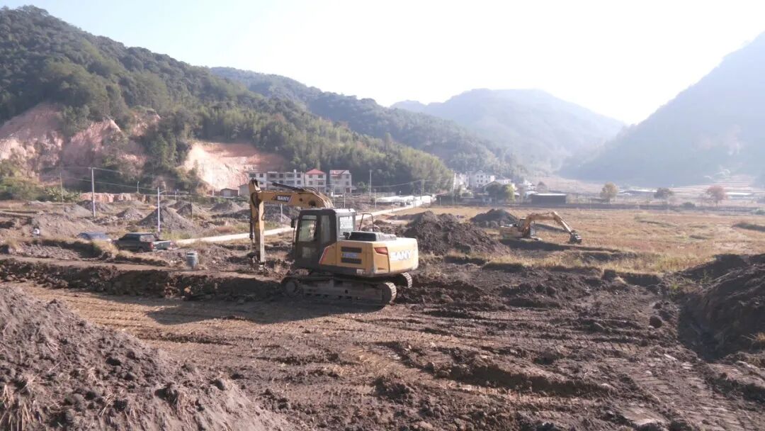 近日,在溪口镇双华村高标准农田施工现场,挖掘机履带碾过松软的泥土,机械臂精准地修整田块,原本零散的土地正逐渐被整合成整齐划一的良田。