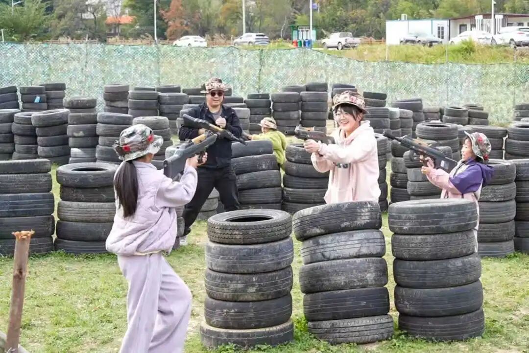 户外真人CS场地上,孩子们奔跑追逐,兴致勃勃;一旁的土灶区炊烟轻起,小朋友围在灶边,期盼着爆米花出炉的香甜时刻。