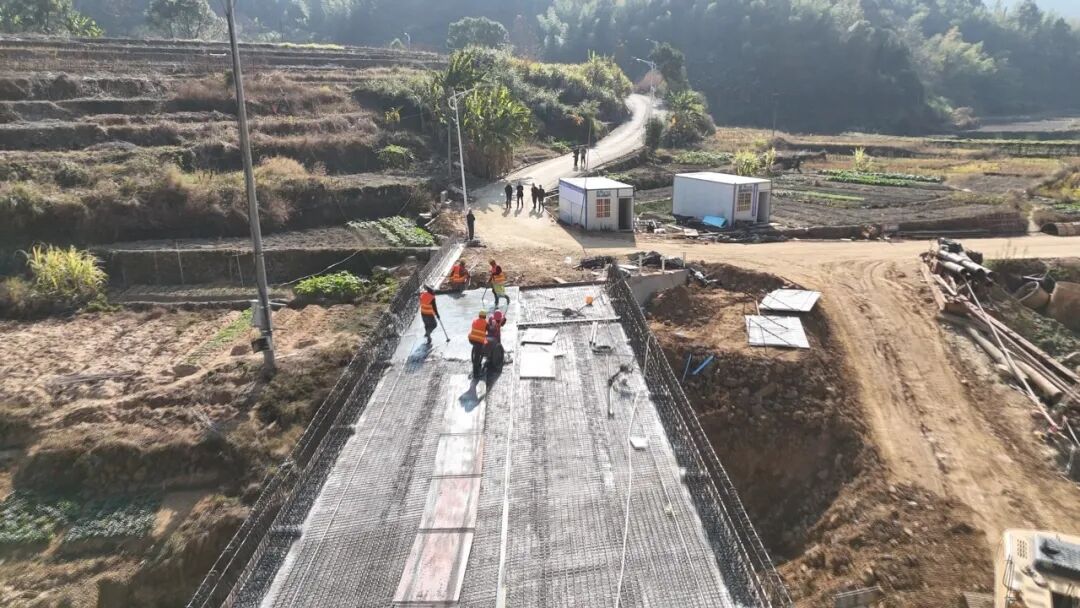 【工程项目现场管理人员 陈锦嵩:目前大桥已完成主体建设,桥面铺装工作正按计划有序推进,明天可以完成桥面铺装,我们预计月底可以完成整个大桥建设。我们在施工中采用了科学的工艺标准,严格把控混凝土配比和铺设厚度。接下来我们会抢抓有利天气,合理调配人力物力,确保工程如期完工,早日方便群众出行。】