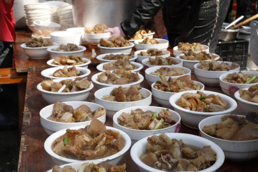 上午,景区内的杀猪仪式拉开活动序幕。农户们按客家传统流程处理生态跑山黑猪,这是当地散养一年以上的优质品种,以玉米、米糠为食,肉质紧实,是杀猪宴的灵魂食材。宴席现场,12道客家菜依次上桌,每一道都承载着地域特色与文化记忆。刚出锅的笋干焖黑猪肉香气扑鼻,肥瘦相间的肉块吸饱汤汁,嚼劲十足;非遗美食红军粉皮纤薄如纸,搭配猪筒骨高汤煮制,柔韧爽滑;此外,红烧猪脚、猪血煮酸菜等经典菜品轮番登场,让游客大快朵颐。