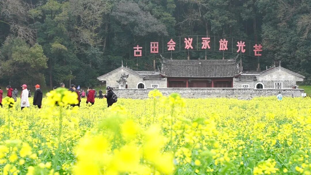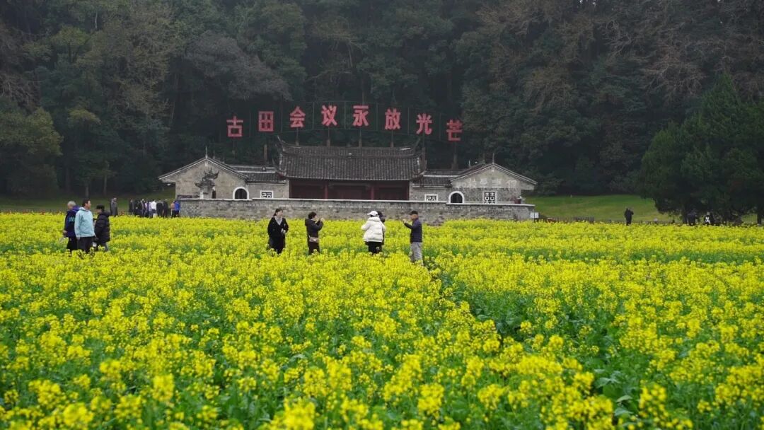 春风送暖,花开圣地。古田会址景区的四季花田内,油菜花竞相绽放,金黄遍野、芳香四溢,吸引各地游客前来踏青赏花、打卡留念,尽享春日美景。
