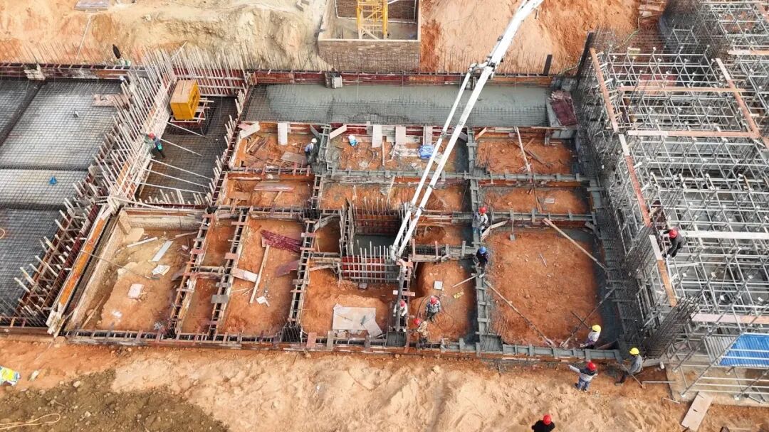 日前,在通贤村项目施工现场,施工车辆往来穿梭,混凝土通过天泵被输送至作业面。工人们有序地进行模板搭架、钢筋绑扎及混凝土浇筑等工作。