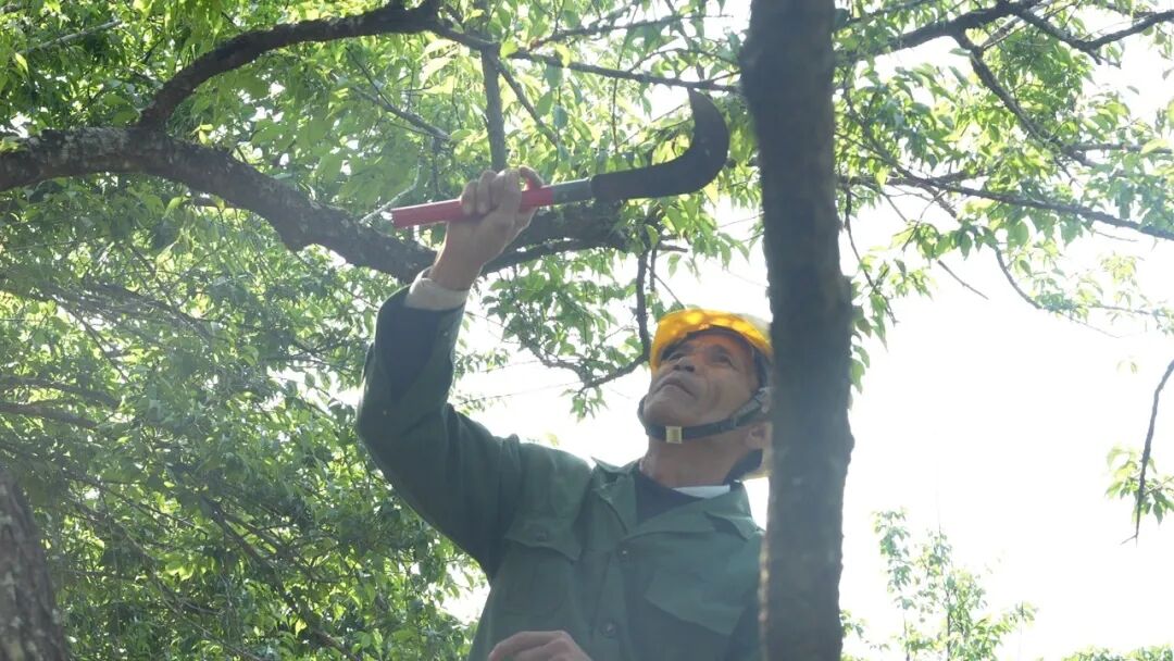 近日,在观音井梅园,工人们踮起脚尖、手持镰刀,正忙着给梅树抹芽,去除过密、位置不当的嫩芽。
